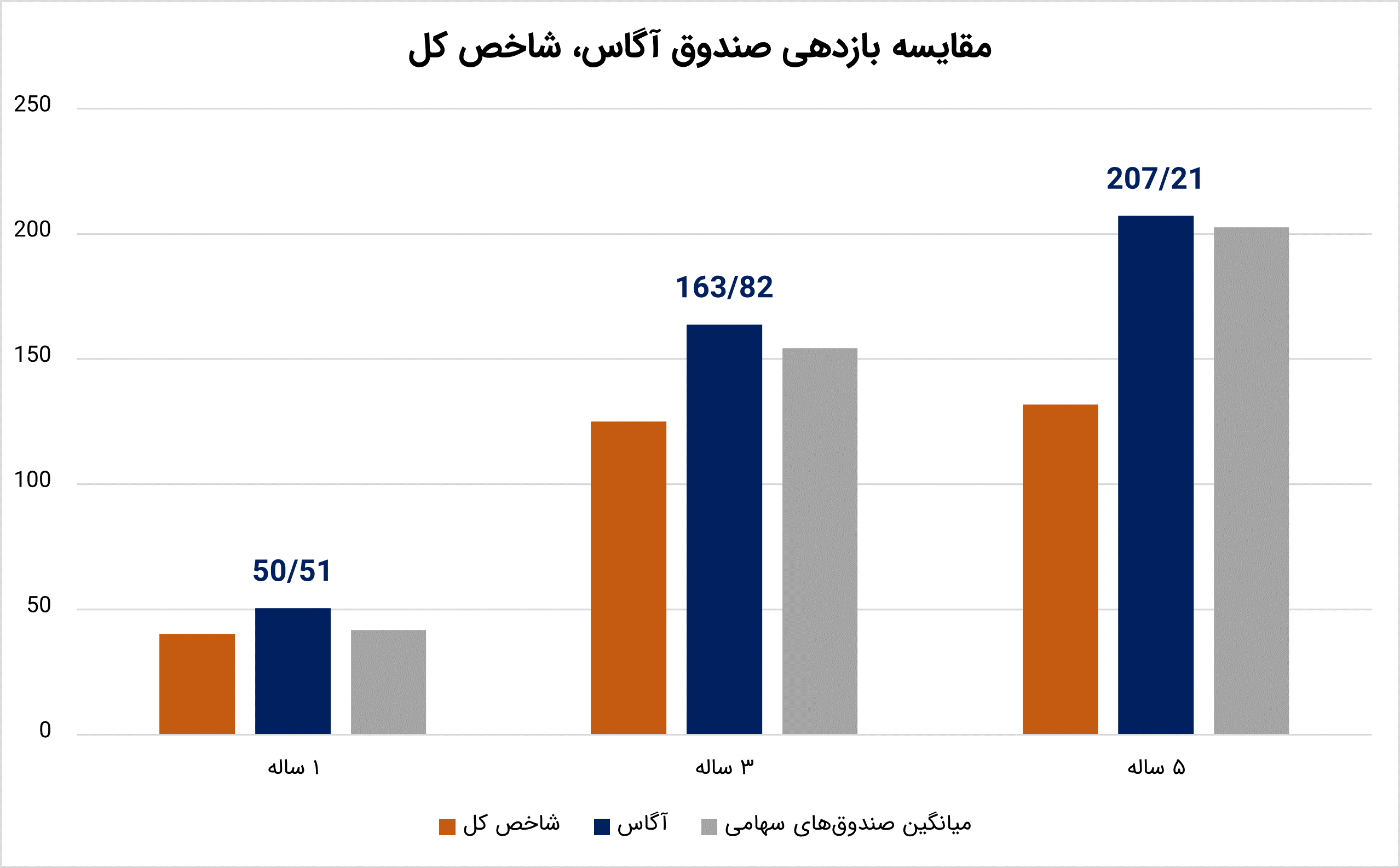 اگر قرار باشد بازدهی آگاس در بازههای زمانی مختلف را با اعدادی معنادار و قابلدرک بیان کنیم، میتوان چنین گفت که اگر در سال ۱۳۹۴ و در زمان تاسیس این صندوق، ۱۰۰ میلیون تومان در آن سرمایهگذاری کرده باشید، ظرف سه سال دارایی شما به ۲۶۳ میلیون تومان، ظرف ۵ سال به ۳۰۷ میلیون تومان، ظرف ۷ سال به ۳ میلیارد و ۴۵۰ میلیون تومان میرسید و امسال در دهمین سال فعالیت آگاس، ارزش دارایی شما در این صندوق به ۱۱ میلیارد تومان رسیده بود.
