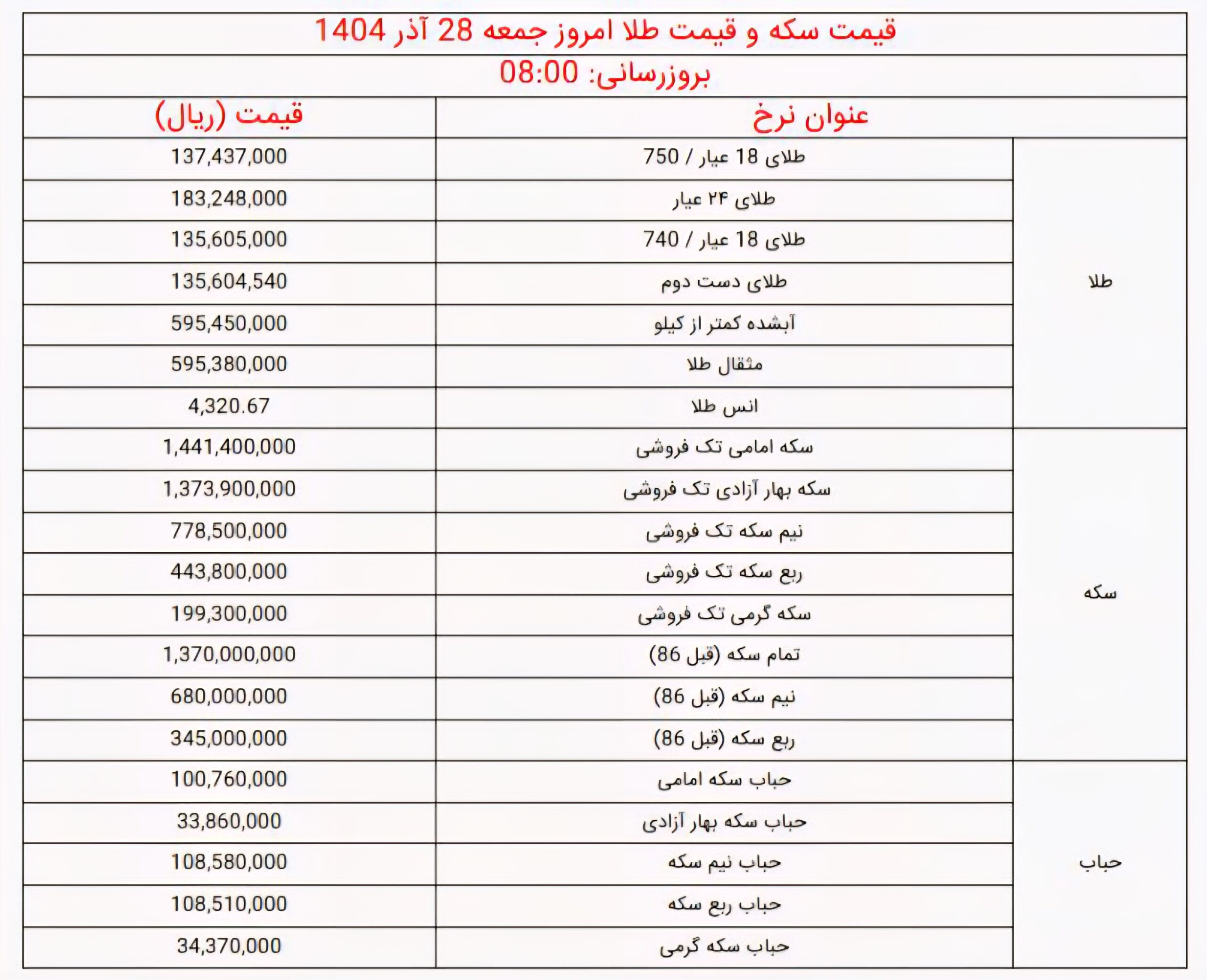 قیمت طلا و سکه امروز جمعه ۲۸ آذر ۱۴۰۴ را در جدول زیر مشاهده خواهید کرد؛
