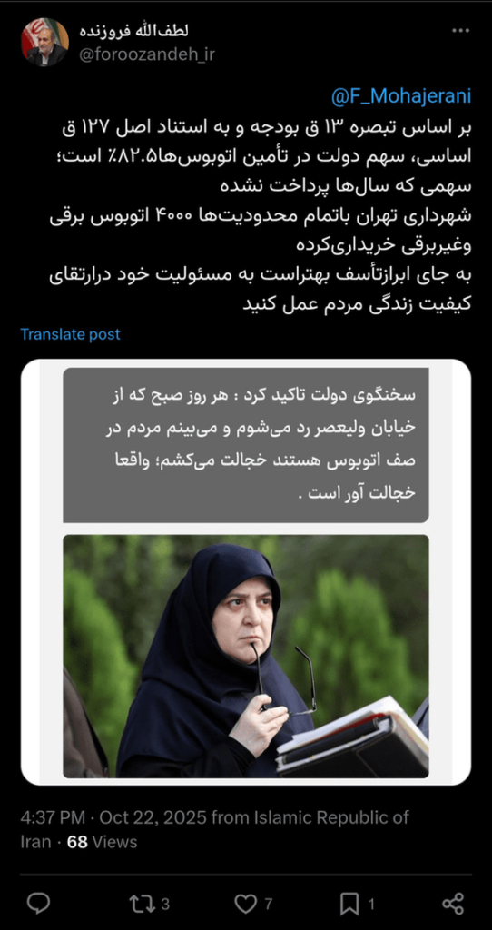 به گزارش اخبار توسعه، در پی اظهارات سخنگوی دولت مبنی بر اینکه «هر روز صبح که از خیابان ولیعصر رد میشوم و میبینم مردم در صف اتوبوس هستند، خجالت میکشم، واقعاً خجالتآور است»، لطفالله فروزنده، معاون هماهنگی امور مناطق شهرداری تهران در حساب کاربری خود در شبکه اجتماعی ایکس نوشت: «بر اساس تبصره ۱۳ قانون بودجه و به استناد اصل ۱۲۷ قانون اساسی، سهم دولت در تأمین اتوبوسها ۸۲.۵ درصد است؛ سهمی که سالها پرداخت نشده. شهرداری تهران با وجود همه محدودیتها ۴۰۰۰ اتوبوس برقی و غیربرقی خریداری کرده است. به جای ابراز تأسف، بهتر است به مسئولیت خود در ارتقای کیفیت زندگی مردم عمل کنید.»